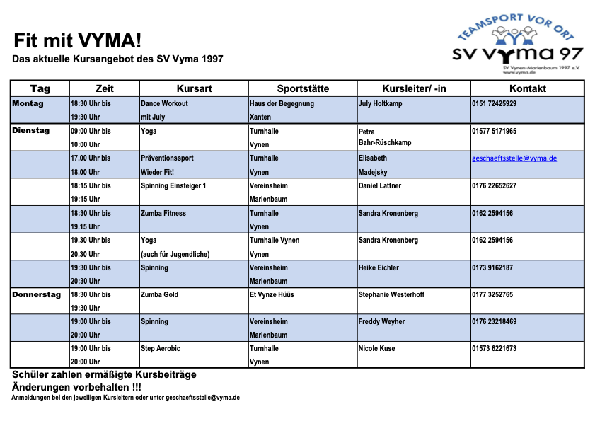 Alle Kurse finden in den vertrauten Räumlichkeiten der Turnhalle Vynen, des Vereinsheims Marienbaum oder im Haus der Begegnung Xanten statt. Schüler:innen profitieren von ermäßigten Beiträgen. Anmeldungen sind direkt bei den Kursleiter:innen oder über die Geschäftsstelle (geschaeftsstelle@vyma.de) möglich.
